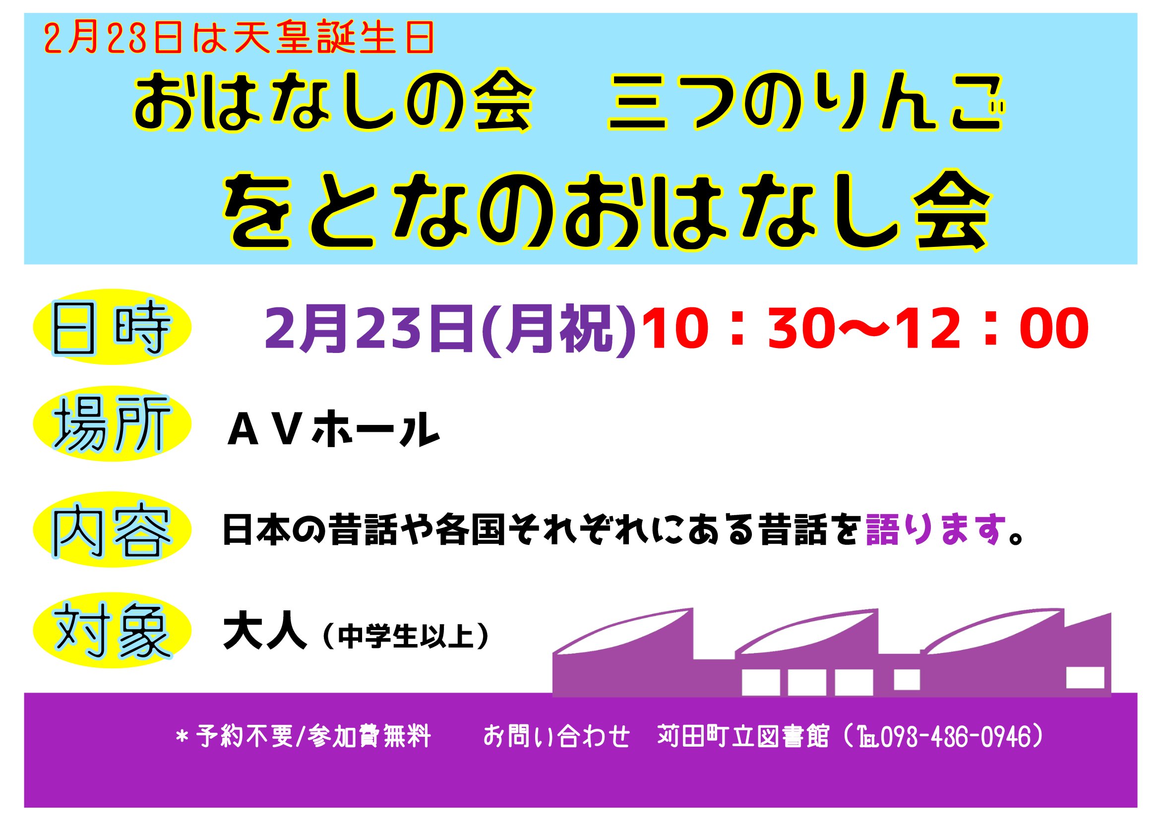 2月23日(月祝)「天皇誕生日」に図書館ではおとな向けのおはなし会を開催します。